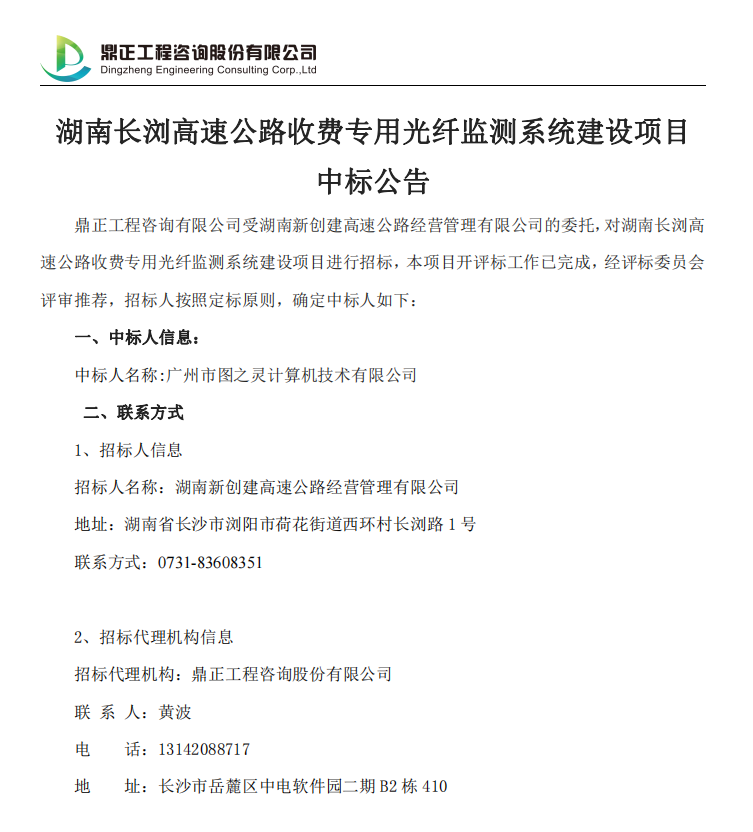 湖南长浏高速公路收费专用光纤监测系统建设项目中标公告