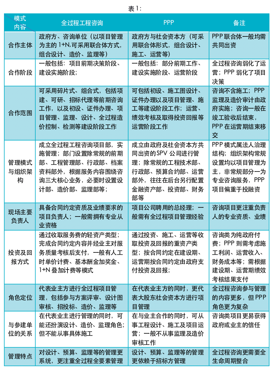 2、全过程咨询与PPP项目管理要素的差异比较(见表1)