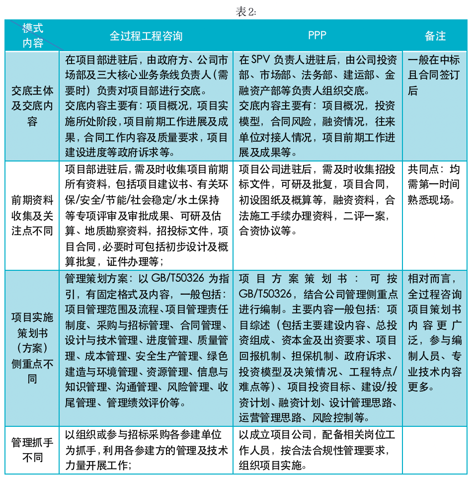全过程咨询项目前期管理与PPP项目前期管理因全过程咨询管理工作更靠前而不尽相同(见表2)