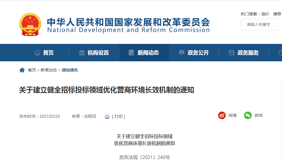 国家发展改革委:关于建立健全招标投标领域 优化营商环境长效机制的通知