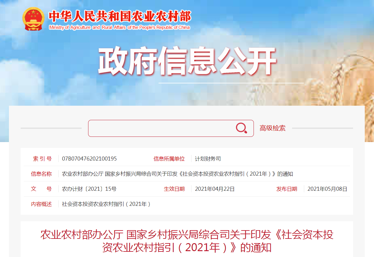 社会资本投资农业农村指引(2021年)