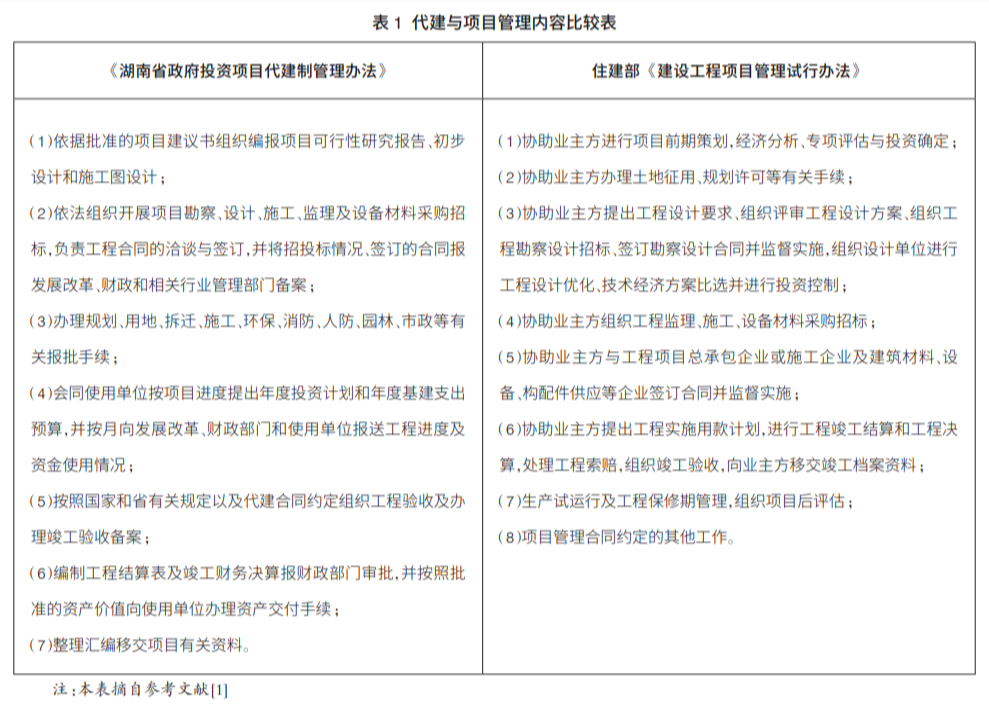 为贯彻2004年国务院发布的《关于投资体制改革的决定》精神,我国非经营性政府投资项目已逐步形成了“政府专业机构代建、政府专业代建公司代建和社会代建单位代建”三种主要模式。2007年,湖南省对社会代建项目作出明确规定,代建服务的业主包含政府职能部门和项目使用方,体现了政府职能部门(发改和财政等部门)对非经营性政府投资项目的监管,而且是可考核的工作。2007年住建部发布的《建设工程项目管理试行办法》明确了为业主服务的项目管理内容(表1),是以“协助”为主的服务,这在当时为推进我国项目管理发展是必要的。目前,从效果考核的角度看,除了有部分是代理业主履行并可考核的工作外,大多的“协助”工作涉及到与业主的相互配合,服务效果难以考核。不能考核的工作要想得到业主和社会的认可是困难的,这也是截至目前无法出台全国性的工程项目管理服务酬金标准的原因之一。