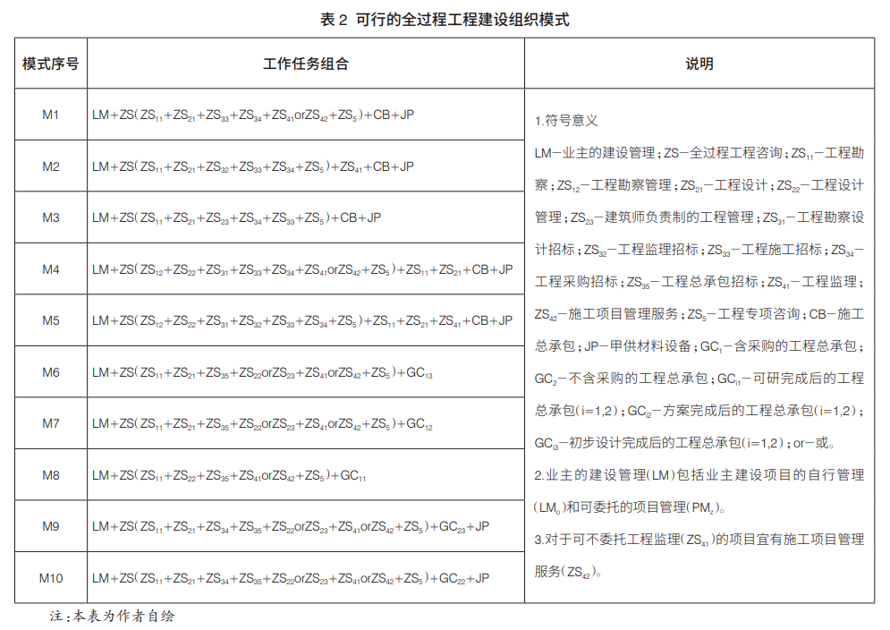 国家鼓励多种形式的全过程工程咨询服务模式,服务内容可以是跨阶段组合或同一阶段内不同类型的组合。据笔者调查,目前业界认可度较高的全过程工程咨询内容主要包括勘察设计、招标采购、监理与施工项目管理服务以及工程专项咨询。其中,工程勘察设计咨询分为工程勘察设计和勘察设计管理服务两种类型;工程专项咨询包括项目融资、工程造价、信息技术等业主所需求的咨询服务。基于这一认识,笔者梳理了建设、勘察设计、监理、施工等单位在工程建设中的关系组合,并列出工程建设全过程主要的建设组织模式,如表2所示。