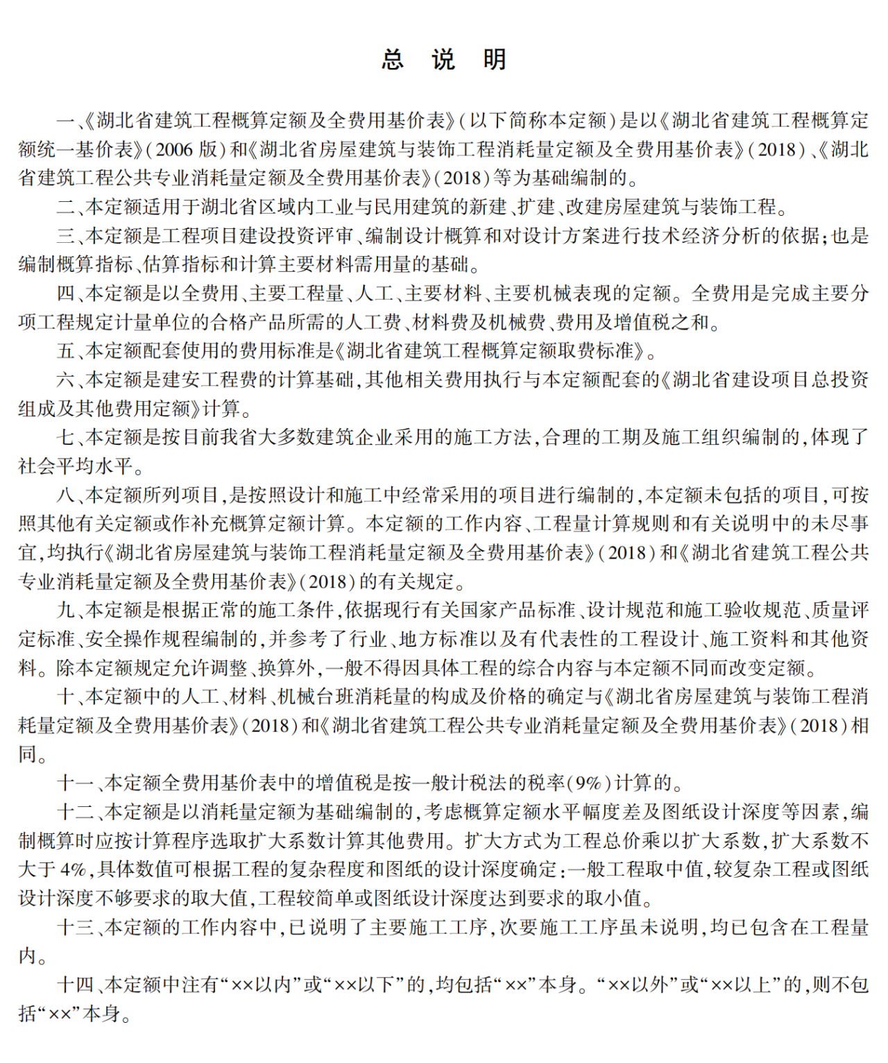 一、《湖北省建设工程概算定额及全费用基价表》是我省工程项目建设投资评审、编制设计概算和对设计方案进行技术经济分析的依据。《湖北省建设项目总投资组成及其他费用定额》是编制、评审和管理可行性研究投资估算和初步设计概算投资的依据。