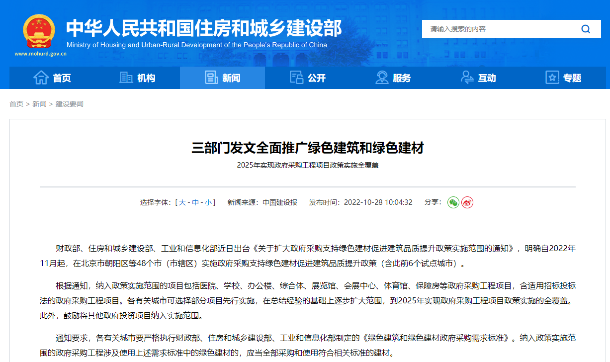 财政部、住房和城乡建设部、工业和信息化部近日出台《关于扩大政府采购支持绿色建材促进建筑品质提升政策实施范围的通知》,明确自2022年11月起,在北京市朝阳区等48个市(市辖区)实施政府采购支持绿色建材促进建筑品质提升政策(含此前6个试点城市)。根据通知,纳入政策实施范围的项目包括医院、学校、办公楼、综合体、展览馆、会展中心、体育馆、保障房等政府采购工程项目,含适用招标投标法的政府采购工程项目。各有关城市可选择部分项目先行实施,在总结经验的基础上逐步扩大范围,到2025年实现政府采购工程项目政策实施的全覆盖。