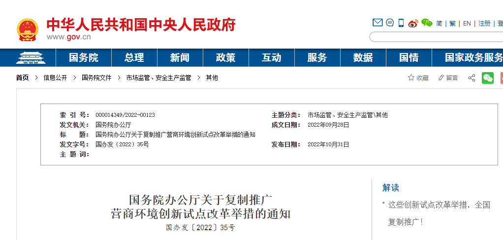 近日,国务院办公厅发布关于复制推广营商环境创新试点改革举措的通知。一是进一步破除区域分割和地方保护等不合理限制,“清除招投标和政府采购领域对外地企业设置的隐性门槛和壁垒”,二是健全更加开放透明、规范高效的市场主体准入和退出机制,三是持续提升投资和建设便利度,“推进社会投资项目‘用地清单制’改革”、“分阶段整合相关测绘测量事项”、“推行水电气暖等市政接入工程涉及的行政审批在线并联办理”、“开展联合验收‘一口受理’”、“进一步优化工程建设项目联合验收方式”、“简化实行联合验收的工程建设项目竣工验收备案手续”、“对已满足使用功能的单位工程开展单独竣工验收”等。四是更好支持市场主体创新发展,五是持续提升跨境贸易便利化水平,六是维护公平竞争秩序,七是进一步加强和创新监管,八是依法保护各类市场主体产权和合法权益,九是优化经常性涉企服务。
