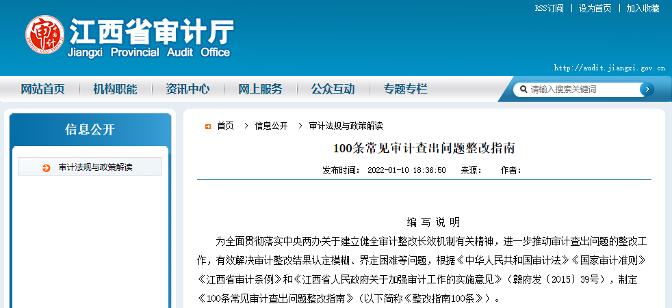 为进一步推动审计查出问题整改工作,加强对审计整改结果认定的指导,江西省审计厅印发了《100条常见审计查出问题整改指南》(以下简称《整改指南100条》)。《整改指南100条》按照常见的重大政策措施落实、预算管理、政府采购及招投标、基本建设、内控管理、企业管理、自然资源、社保资金及安居工程、金融管理、国外贷援款共10类审计内容进行问题分类,列举了100个常见问题并给出相对应的整改方法说明,供审计机关和整改责任单位在审计整改工作中参照落实。整改特色亮点一是突出落实被审计单位整改主体责任;二是突出健全完善长效机制;三是突出问题分类整改。