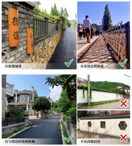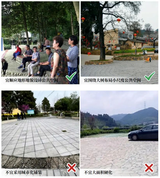 延续原有村落依山、靠林、面水的空间格局:尊重场地高差变化,形成“错台组团、街巷里坊”的平面布局,提倡三级街巷连通,避免“兵营式、排排坐”;营造公共空间,完善公服设施,传承民俗文化,留住乡愁记忆:还原乡野气息,鼓励宅前屋后栽种瓜果梨桃,构建“桃花红、李花白、菜花黄”的自然景观,营造“莺儿啼、燕儿舞、蝶儿忙”的乡村生境。