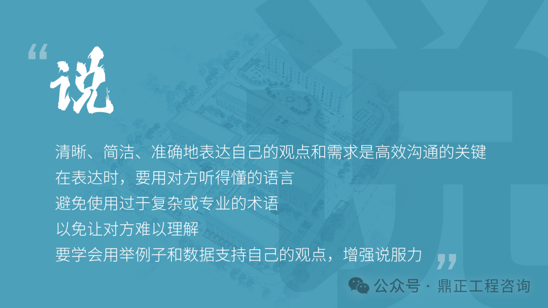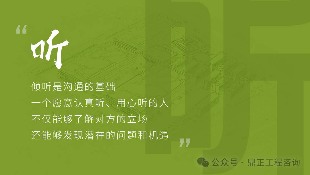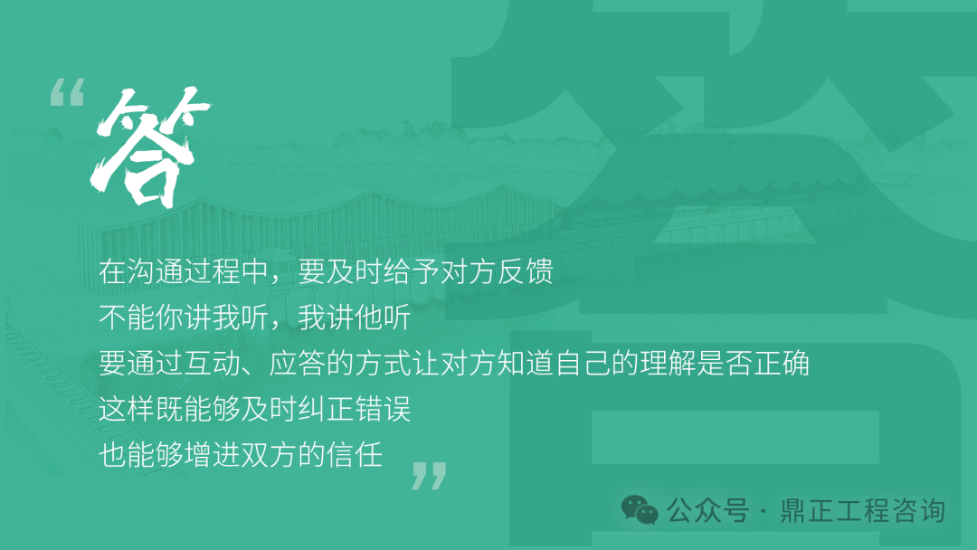 交流要看对象,不能对牛弹琴。与农民工交流要用农民工听得懂的语言;与同行或其他咨询机构交流要用专业语言;与直接上级交流要及时反馈并提出合理建议;与客户交流,要从客户的视角出发,为其提供最优解决方案。