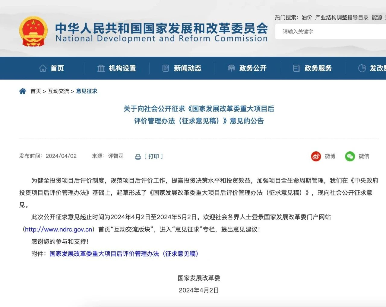 国家发改委发布国家发展改革委重大项目后评价管理办法(征求意见稿)