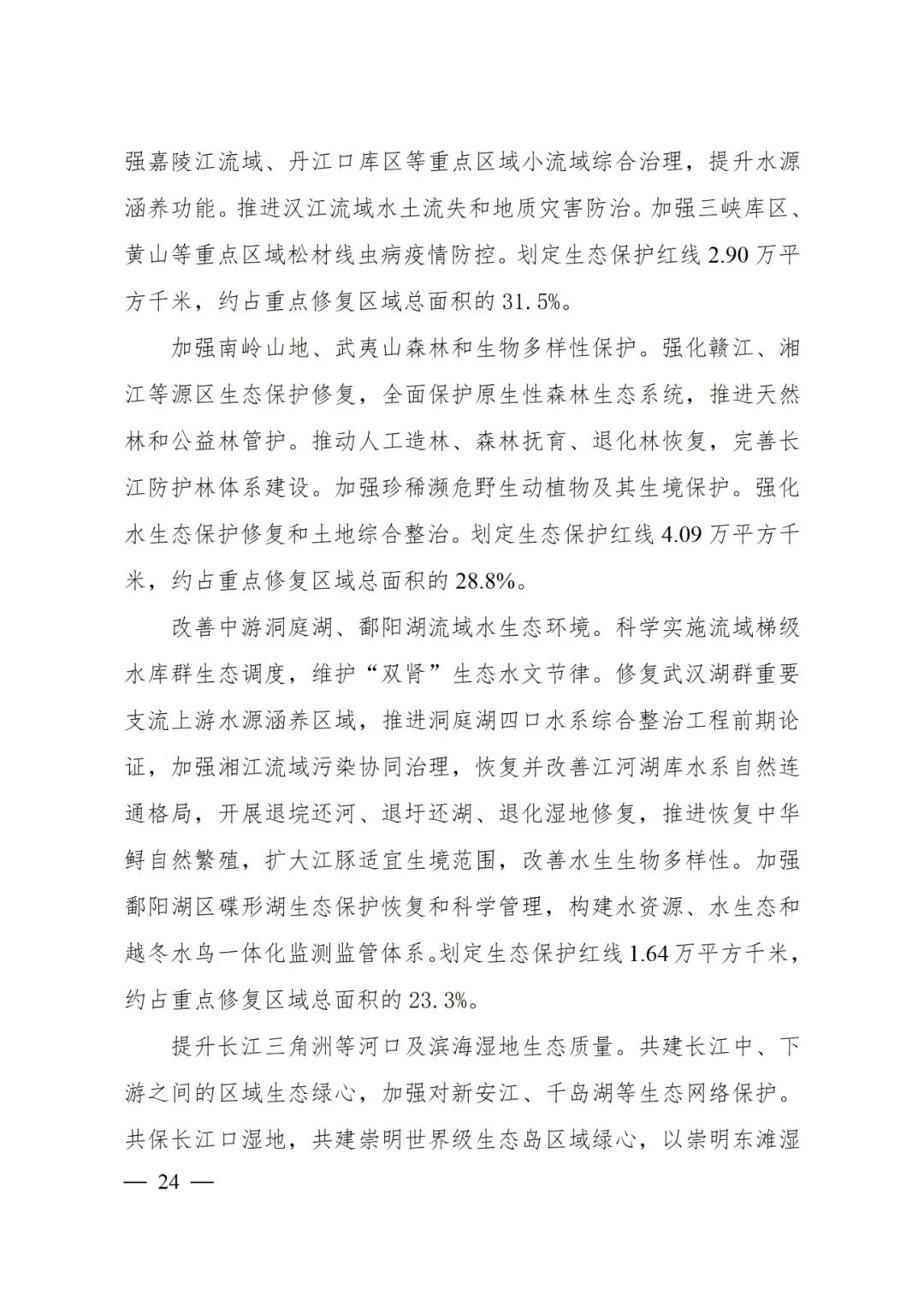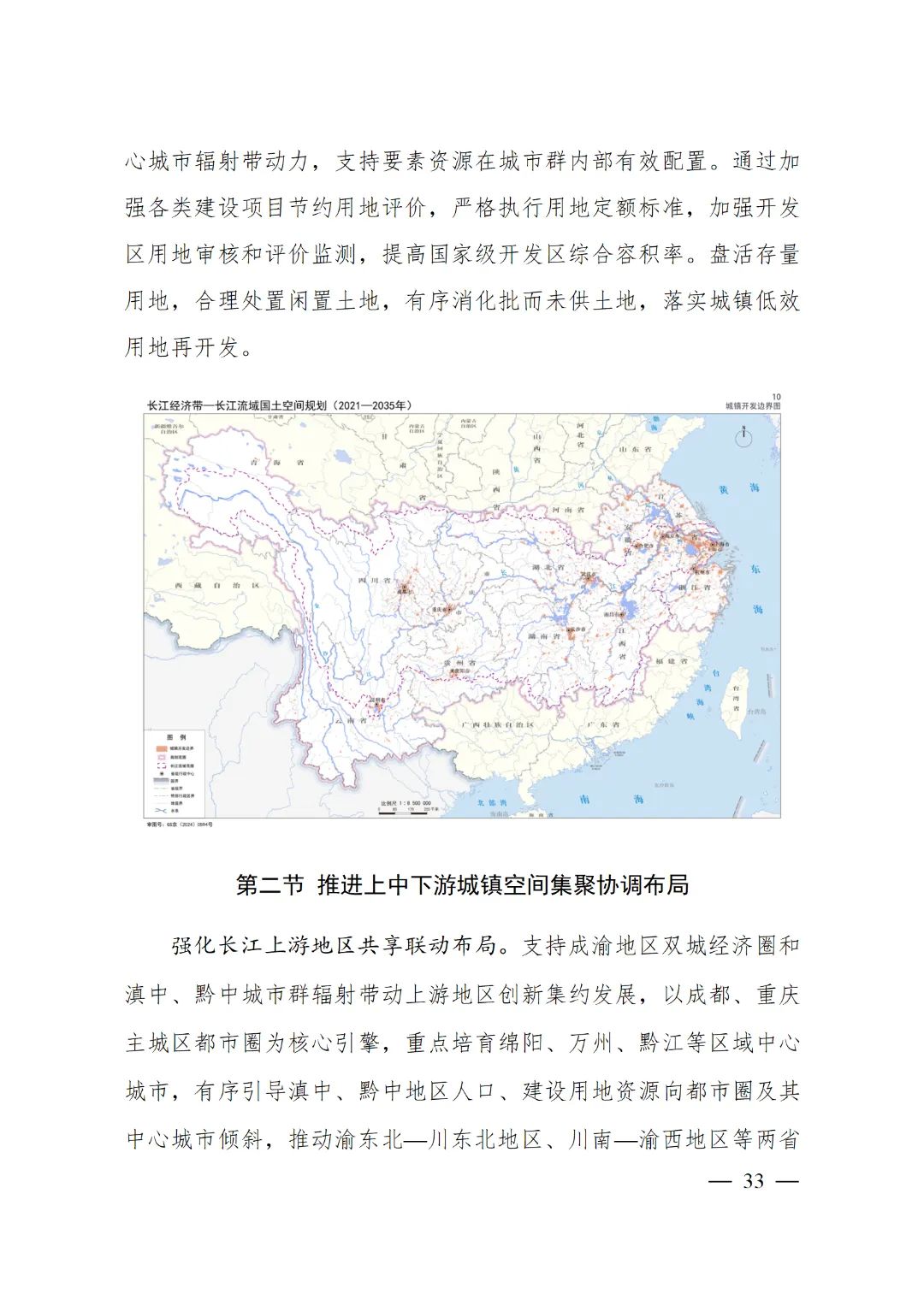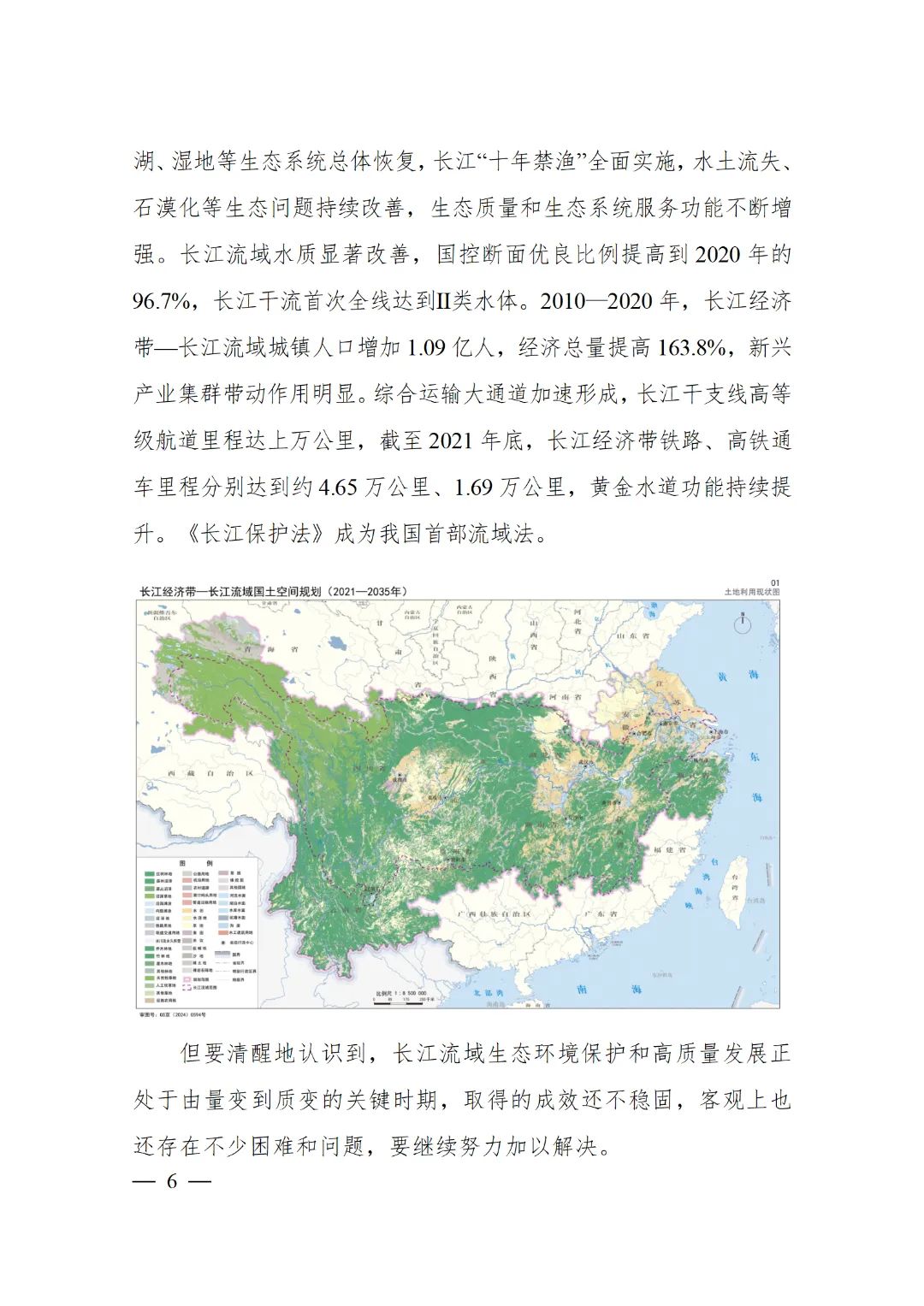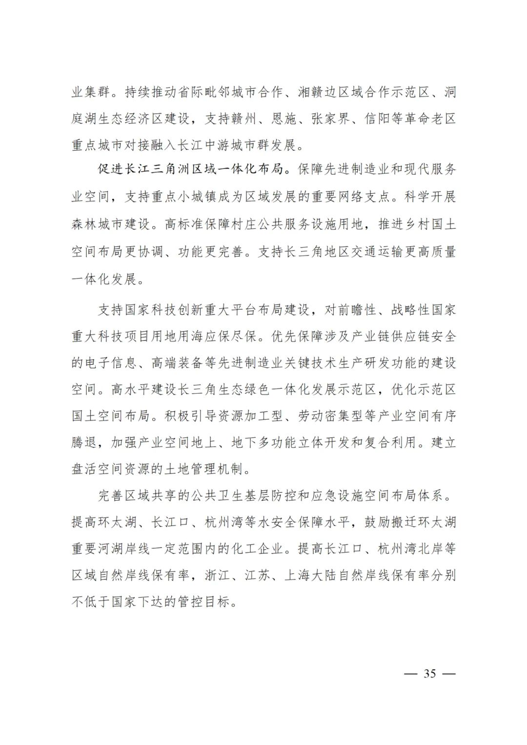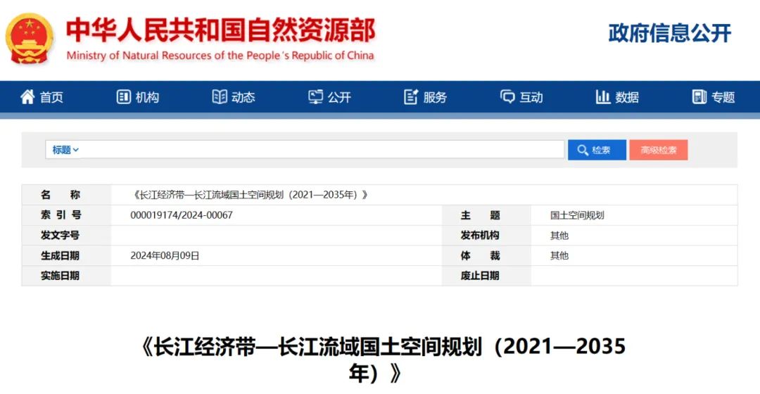 2024年2月9日,《长江经济带—长江流域国土空间规划(2021—2035年)》经国务院批复同意。9月10日,自然资源部正式印发《长江经济带—长江流域国土空间规划(2021—2035年)》。规划范围包括长江经济带11个省(市)全域,以及《长江保护法》规定的长江流域其他8省(区、市)的相关县级行政区域,共计1173个县级行政区域。规划范围包括陆域国土和内水、领海。其中,陆域面积240万平方公里。(后附规划范围详细表格)规划期限为2021年至2035年。