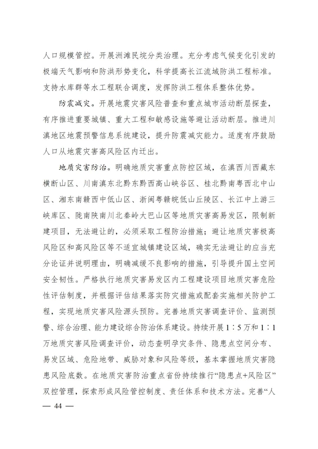 地质灾害防治 明确地质灾害重点防控区域,在滇西川西藏东横断山区、川南滇东北黔东黔西高山峡谷区、桂北黔南粤西北中山区、湘东南赣西中低山区、浙闽粤赣皖低山丘陵区、长江中上游三峡库区、陇南陕南川北秦岭大巴山区等地质灾害高易发区,限制新建项目,无法避让的,必须采取工程防治措施;避让地质灾害极高风险区和高风险区等不适宜城镇建设区域,确实无法避让的应当充分论证并说明理由,明确减缓不良影响的措施,引导提升国土空间安全韧性。