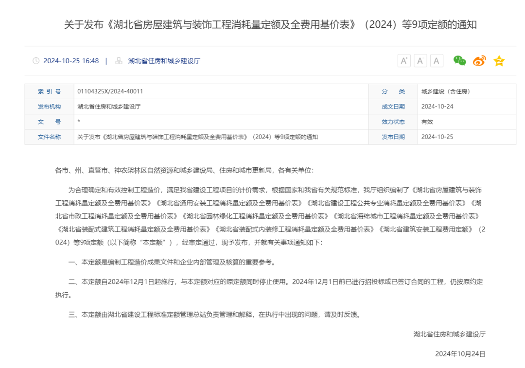 ▲《湖北省房屋建筑与装饰工程消耗量定额及全费用基价表》(2024)等9项定额正式发布