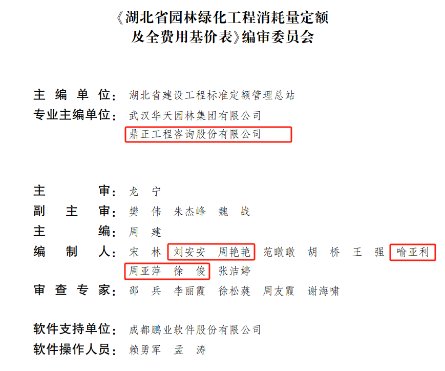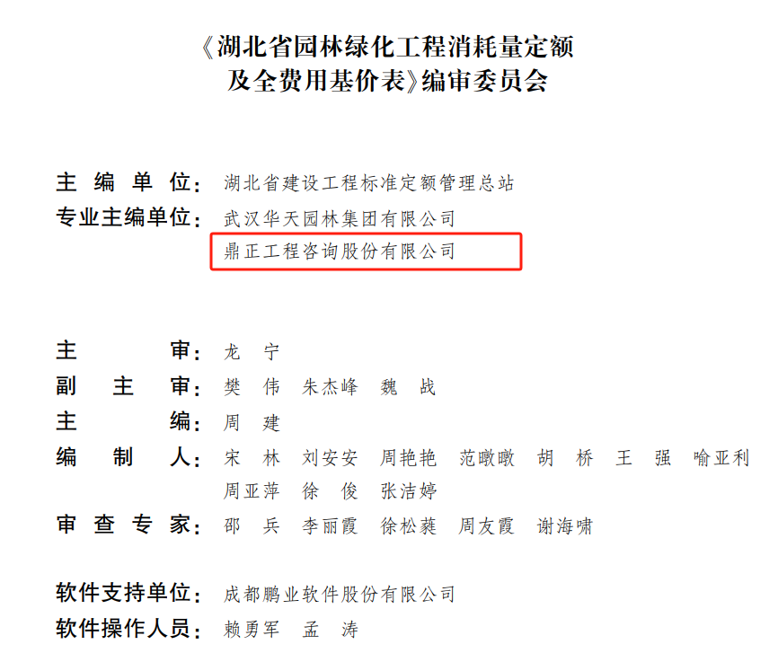 鼎正作为《湖北省园林绿化工程消耗量定额及全费用基价表》《湖北省建筑安装工程费用定额》的参编单位之一,充分发挥全过程工程咨询资源集中的优势,为此次定额的修订贡献了鼎正在全过程工程咨询、工程造价咨询业务领域编审设计概算、投资估算、工程预算、过程结算、竣工结算等实践经验,对进一步完善工程造价计价依据体系提供了有力的技术支撑。