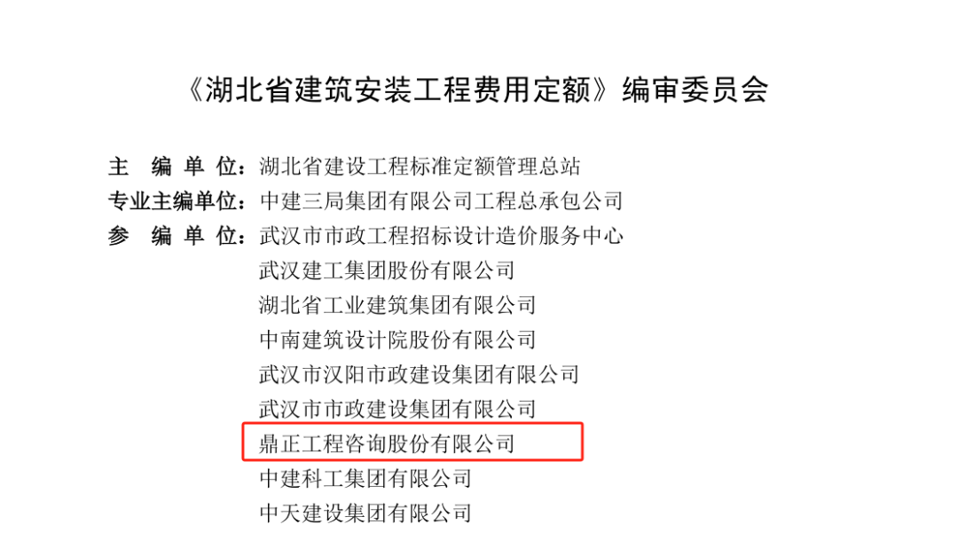 鼎正高度重视标准化工作,多次参与国家、地方及行业标准编制。此次参与《湖北省建筑安装工程费用定额》《湖北省建筑安装工程费用定额》的定额编制,既是鼎正多年坚持多年各咨询板块专业化沉淀和发展的集中体现,更是鼎正履行推动行业进步、规范建设市场行为的专业职责所在。下一步,鼎正将继续发挥专业优势,集结公司更多骨干专家力量,为提升行业整体标准化水平、促进行业的高质量发展贡献专业力量。