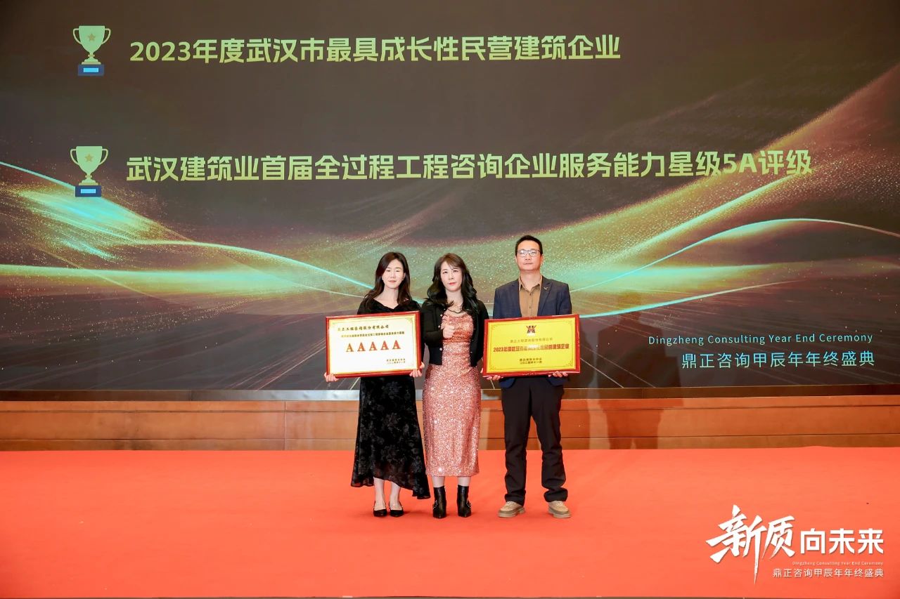 在过去的一年里,鼎正在专家辅助人、专项债、超长期特别国债、中央预算内资金、全过程工程咨询等业务板块中,展现出强劲的创新力,并获得行业广泛的认可。当晚,武汉建筑业协会领导代表、全咨分会秘书长陈金琳女士,为我们颁发了2023年度武汉市最具成长性民营建筑企业、武汉建筑业首届全过程工程咨询企业服务能力星级5A评级两项荣誉。