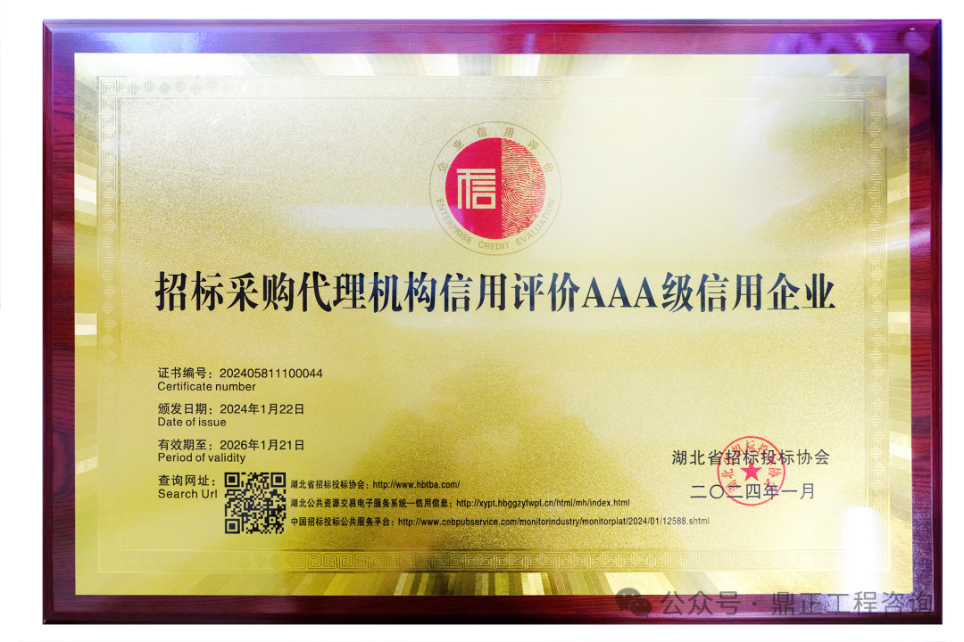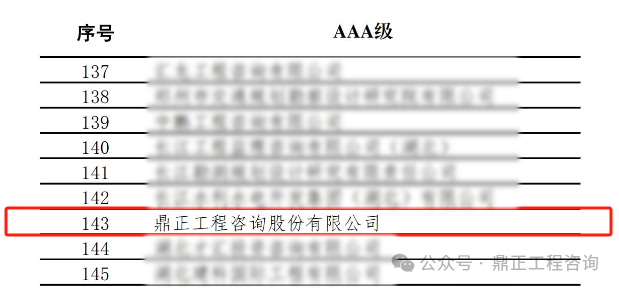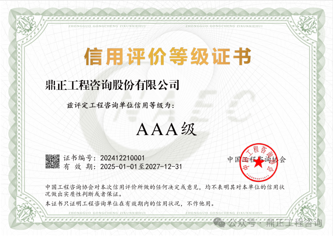 近日,中国工程咨询协会发布了2024年度工程咨询单位信用评价公告,鼎正凭借优异的诚信建设和信用管理能力,荣获“AAA级信用等级”评价。
