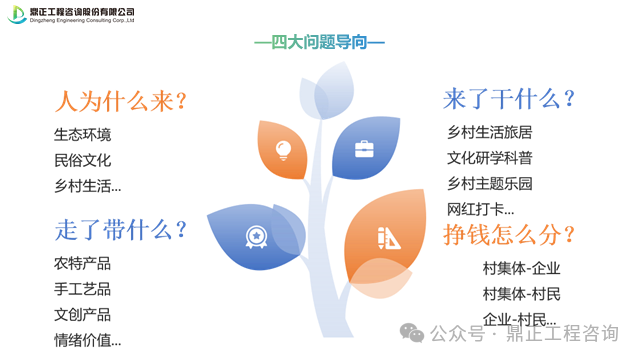 围绕人为什么来、来了干什么、走了带什么、挣钱怎么分四大问题去思考乡村该怎么运营,去明确乡村的主题定位、发展方向、核心产品、运营方式,更好地推进乡村运营。
