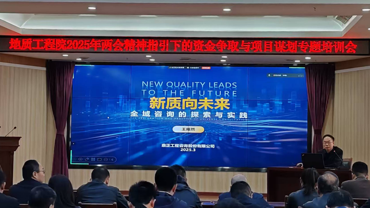 4月2日上午,湖北省城市地质工程院组织召开“2025年两会精神指引下的资金争取与项目谋划专题培训会议”,鼎正董事长王雁然、副总经理彭亮受邀担任主讲嘉宾,并作专题培训交流。