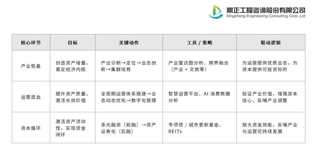 城市更新的本质是“产业价值发现 — 运营价值提升 — 资本价值实现”的过程。通过产业精准定位创造资产增量,运营精细化管理提升资产质量,资本工具创新激活资产流动性,最终形成“产业筑基 — 运营造血 — 资本循环”的可持续生态,推动城市从“空间更新”迈向“价值再生”。
