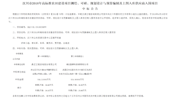 2018年4月11日,我司中标“汉川市2018年高标准农田项目”,该项目位于湖北省汉川市,项目规模约17万亩,对汉川市2018年高标准农田建设项目进行测绘、可行性研究、规划设计与预算编制,中标金额为544.21万元,中标单价为新建1万亩(36.68万元)和补建一万亩(26.10万元)。