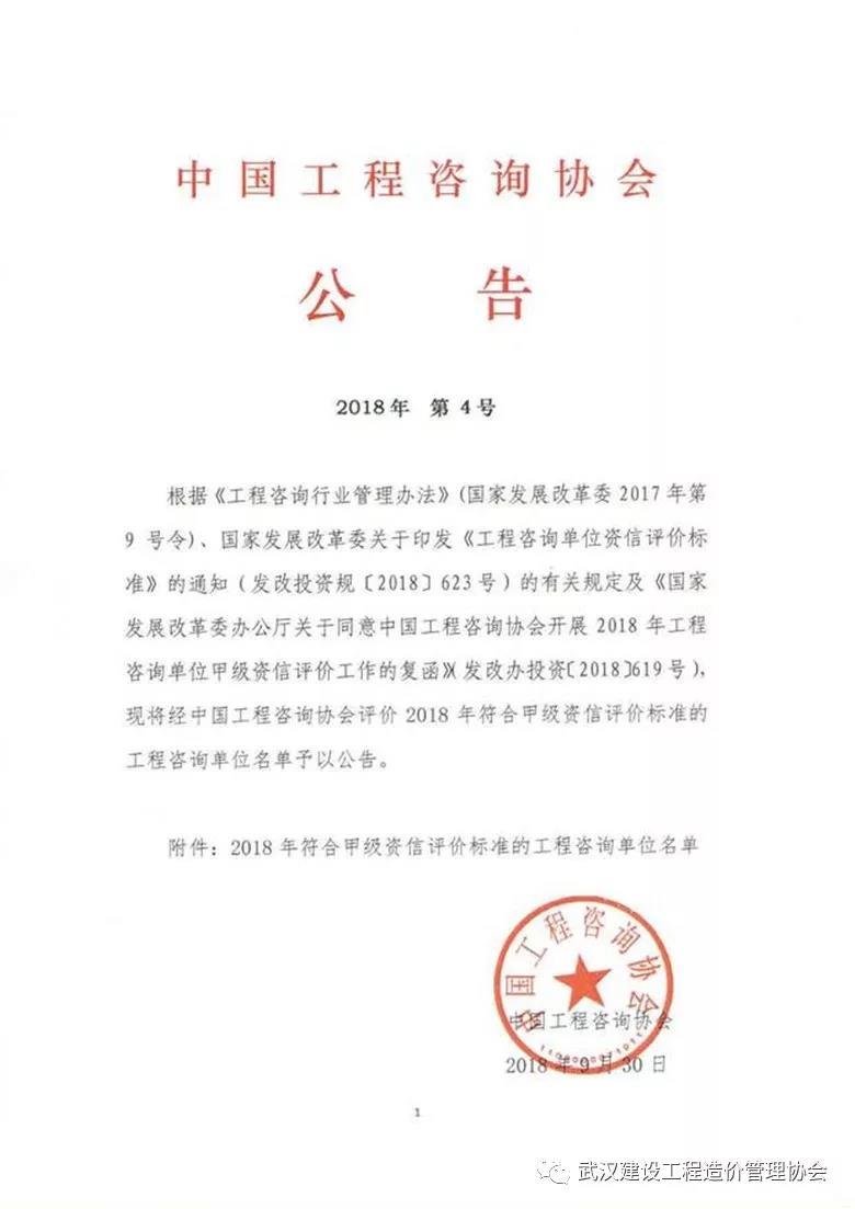 2018年9月19日,中国建设工程造价管理协会发布了“2018年度全国工程造价咨询企业信用评价结果”,此次湖北省仅有22家工程造价咨询单位获得AAA信用评级,我司从全国众多参评单位中脱颖而出,获此荣誉。