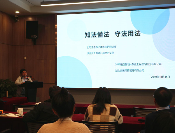 11月15日下午,我司组织开展了2019 年公司法概论与风险防控知识培训。本次培训邀请湖北诺善风险管理有限公司王振宇律师、冯美渊律师就《公司法》实务知识进行讲解,公司董事长王雁然、副总经理毛迎霞、技术总监朱立冬、副总经理姚建功等领导及各部门中层管理人员、企业发展中心、行政中心全体成员参加了本次培训,各分公司同事远程同步参与学习。