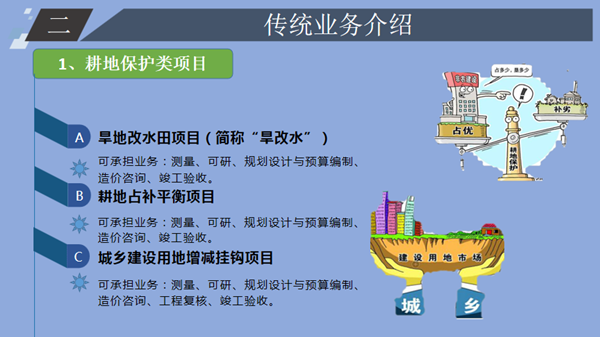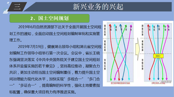 下午,来自自然资源事业部的胡小虎进行了《新形势下的自然资源咨询业务探析》的主题分享。胡小虎结合2018年3月自然资源部、农业农村部组建成立的背景,对自然资源传统业务、新兴业务的兴起做出了详细介绍,并从“客户基本信息分析”、“客户采购项目分析”、“市场分析”、“从业单位分析”、“拟拓展方向”五个方面对自然资源咨询业务进行了分析。